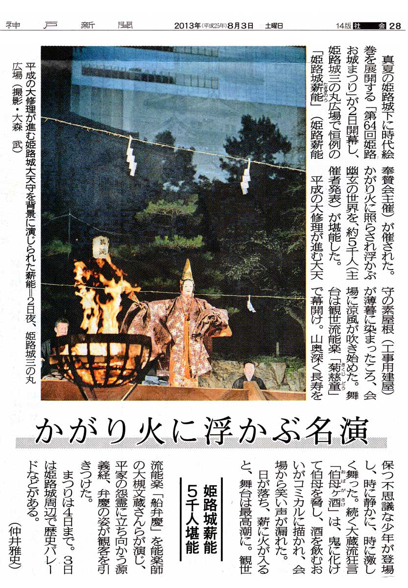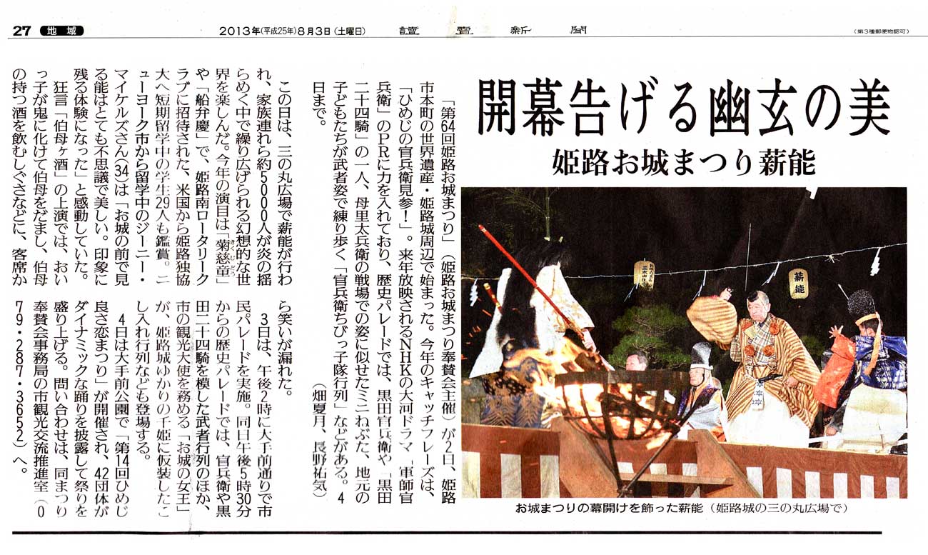 第43回姫路城薪能の記事が8月3日の神戸新聞と読売新聞に掲載されました。